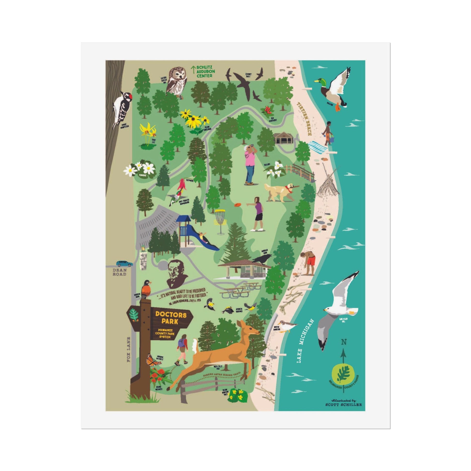 The Milwaukee County Parks system features over 150 unique parks, each with its own distinct character. In 2018 and 2019, Milwaukee County Parks collaborated with local artists, designers, and illustrators to create spectacular park maps, each showcasing the artist's distinctive style.