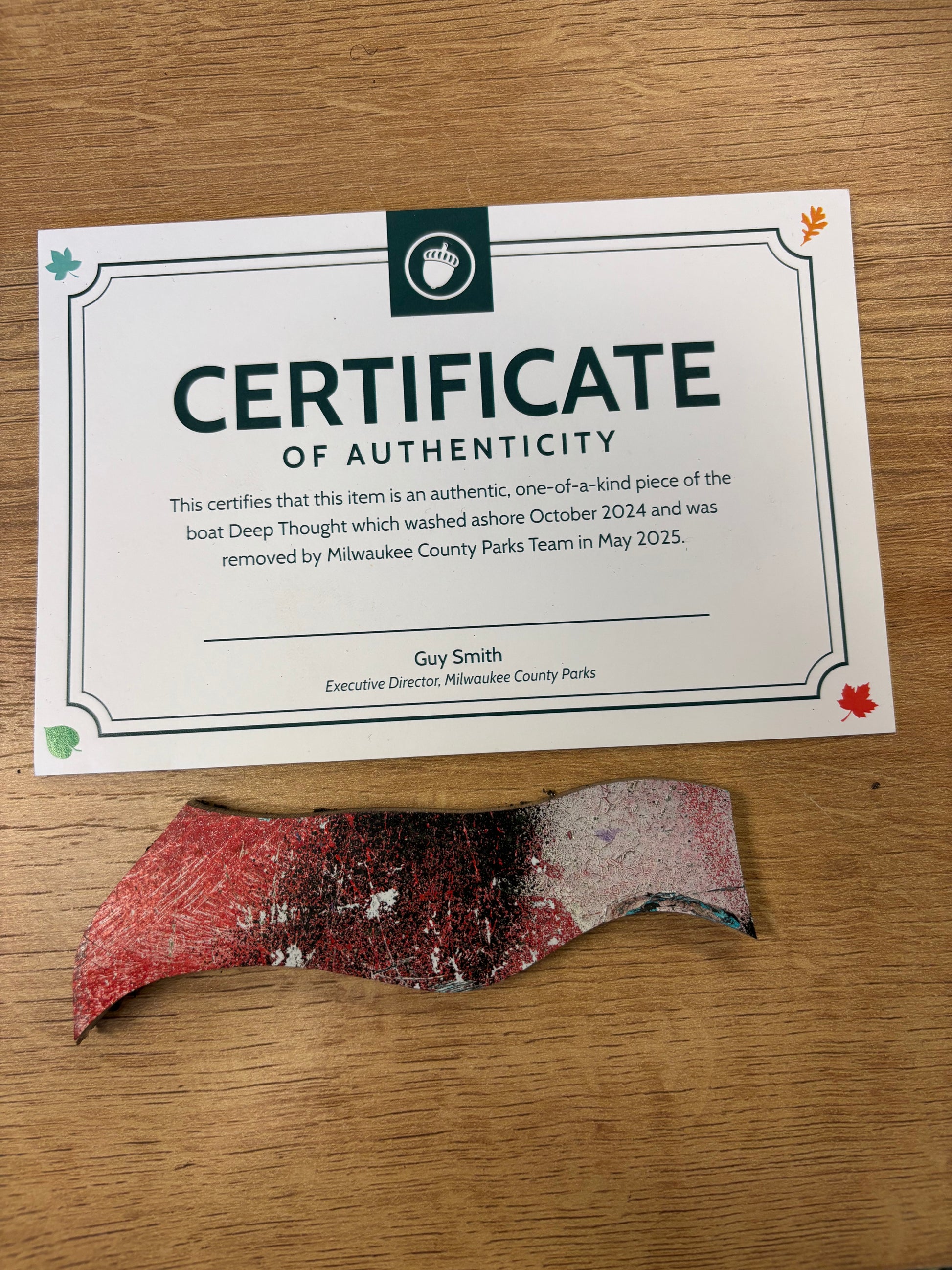 Get your hands on a one-of-a-kind piece of the boat Deep Thought. The boat washed ashore in October 2024 and was removed by Milwaukee County Parks team in May 2025.